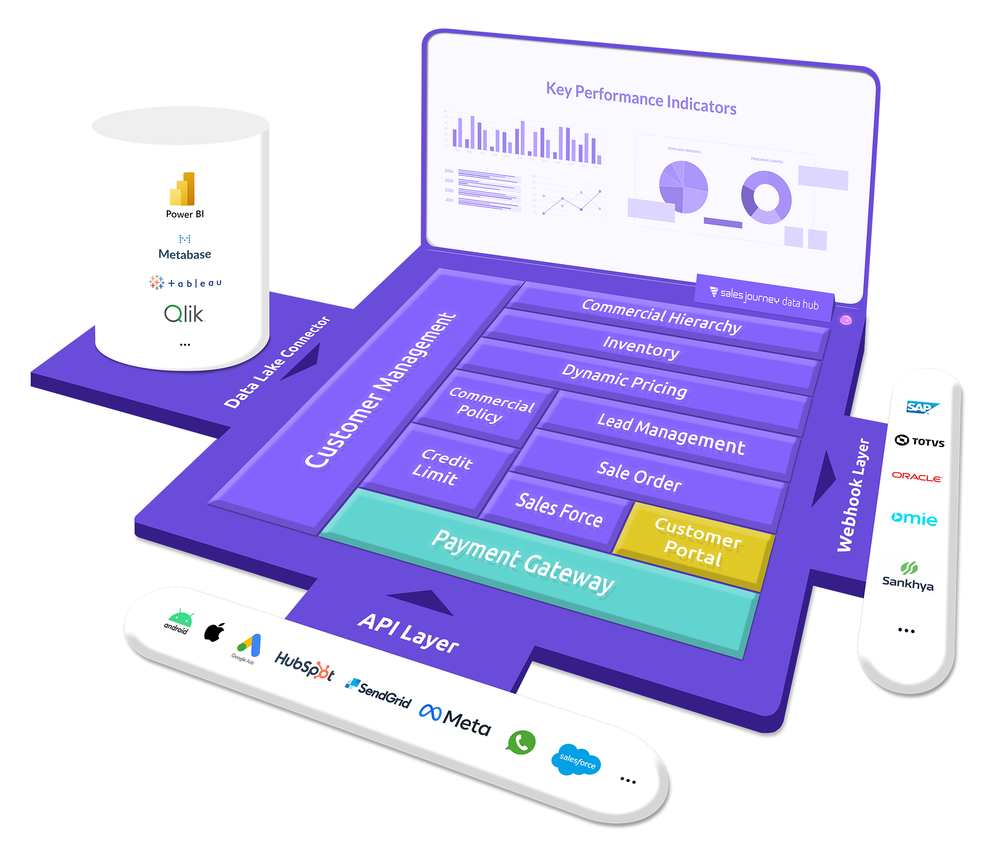 The Sales Journey is a SaaS platform, built-in over a cloud-native approach and offers a entire layer of integration based on REST APIs and Webook Events. All Sales Journey features can be manipuled by the integration layer: